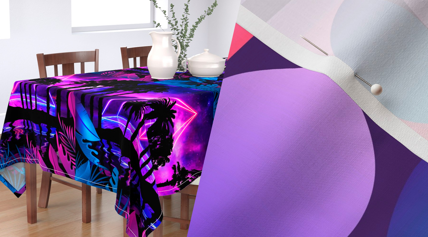 Synthwave neon fabric: kitchen textile, neon vivid patterns, space textures