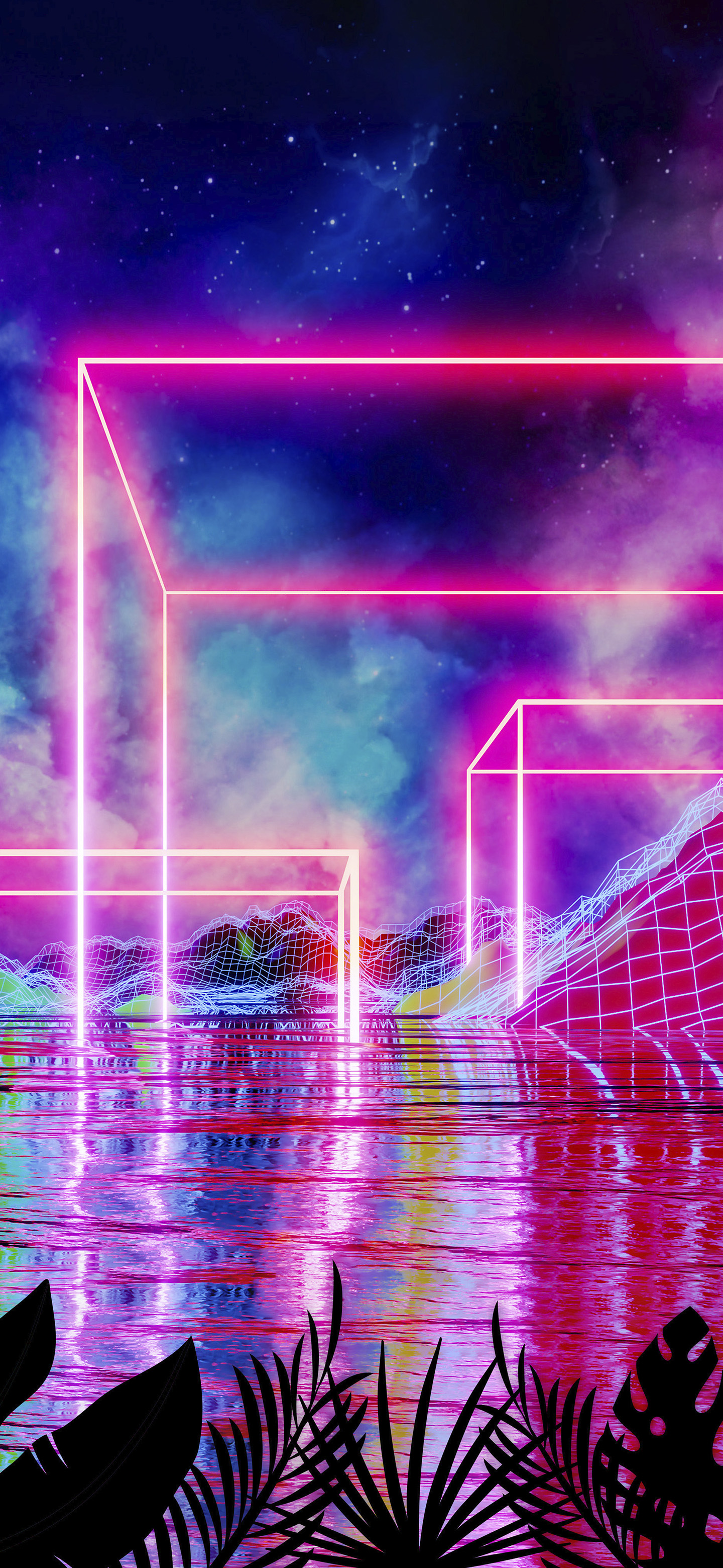 Neon palms landscape: Cube — phone wallpaper / 1440×3118, JPEG