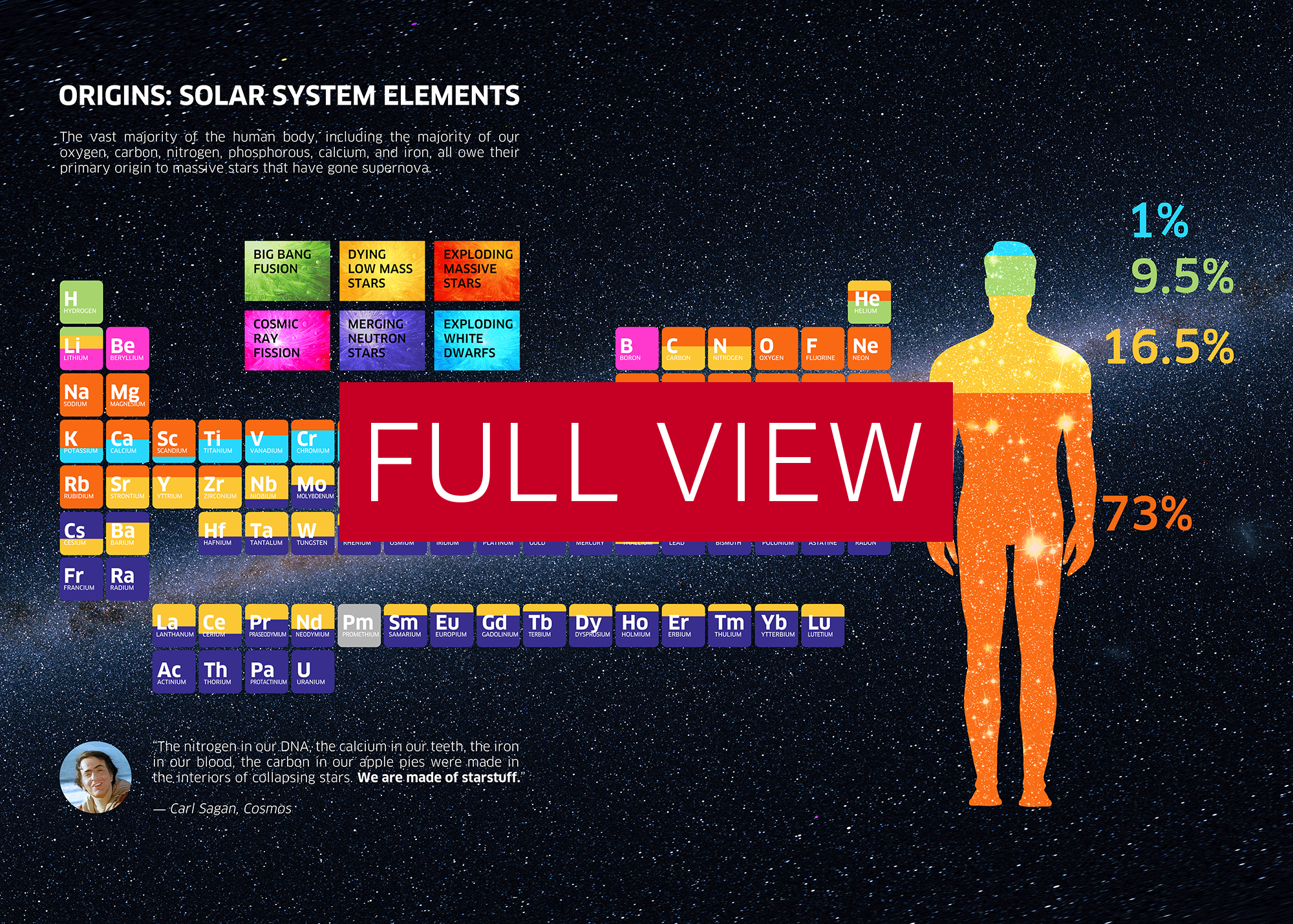 The vast majority of the human body, including the majority of our oxygen, carbon, nitrogen, phosphorous, calcium, and iron, all owe their primary origin to massive stars that have gone supernova. You can see this in our other science poster, Origins: Solar system elements.