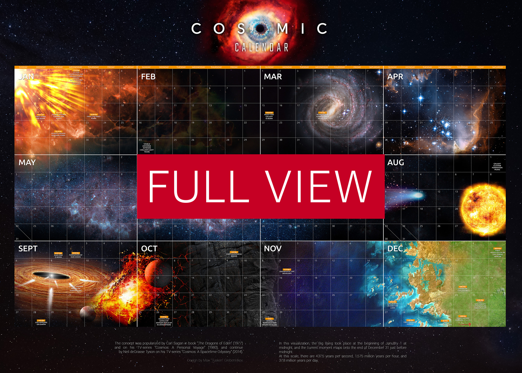Cosmic Calendar (Carl Sagan style), Universe evolution chart — space poster, science poster. Also on eBay and Displate.